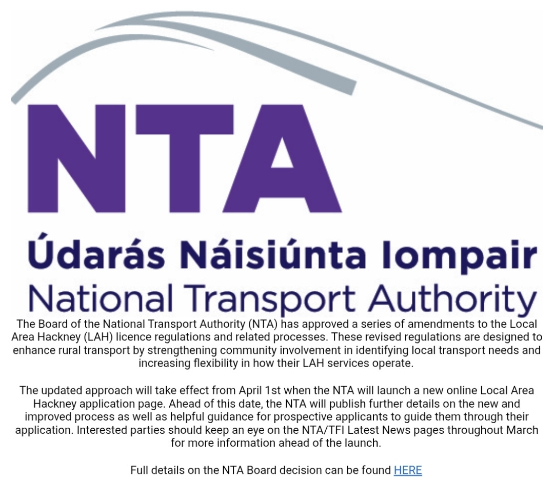 Not much call for Cosies since entry liberalisation.... apart from them immigrants... there does be 18 of them working one car, all doing 22 hour shifts. I'm not sure that it'll be much different for LAHs but it's better to have NTA tinkering around the edges of that scheme than taking a proper look at how rideshare platforms operate elsewhere. I think they've issued less than 2 LAH plates per year since the scheme was introduced over a decade ago. If they were serious about tackling rural transport shortages they'd lift the current temporary moratorium on the issue of saloon hackney plates and restrict taxis to EVs under 3YO. That could also bring Cosies back into the equation, I guess.