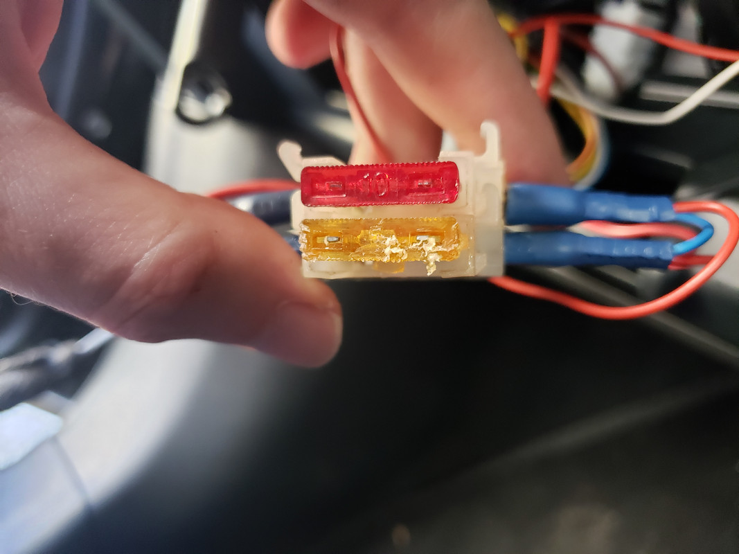 meter beeped and went dead once or twice last week and was totally dead yesterday. i fiddled with the wiring and noticed that when i press down hard on the yellow 5 amp blade fuse i replicated the problem. new fuse problem solved. the damage to the top was from trying to pull it out with a little pliers.