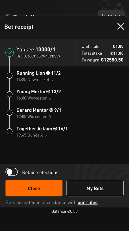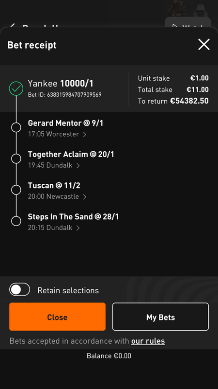 10 x €15 EW Trebles, 5 x €15 EW Quads.