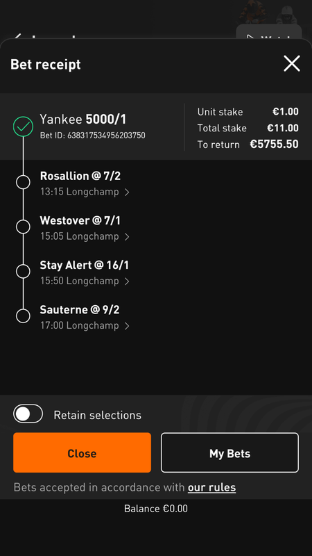 3 winners showing a profit of €260.75 less 5 x €25 losers and €1 yankee loser shows a profit on the day of €124.75.