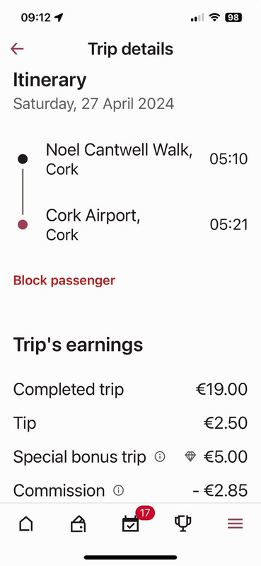 I accepted an airport from the Artane ryndabyte last night. Only when I was processing it for the sum of €21.80 did I realise the poor sucker must have pressed the wrong button and I got a €10 bonus.