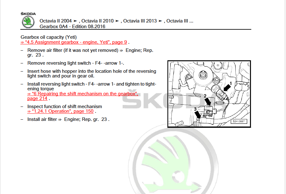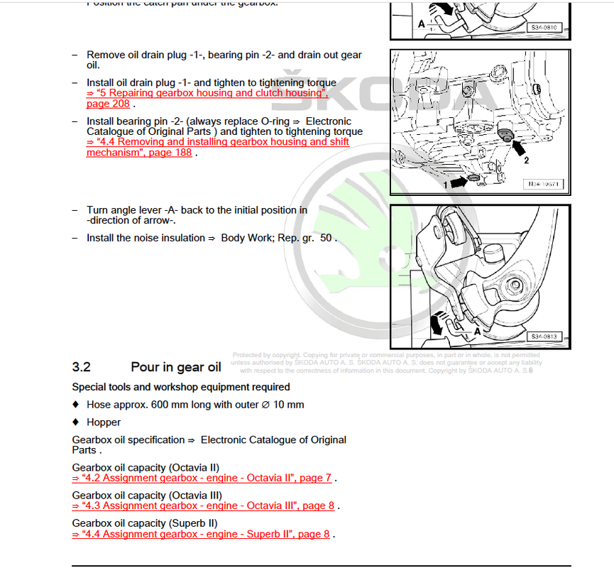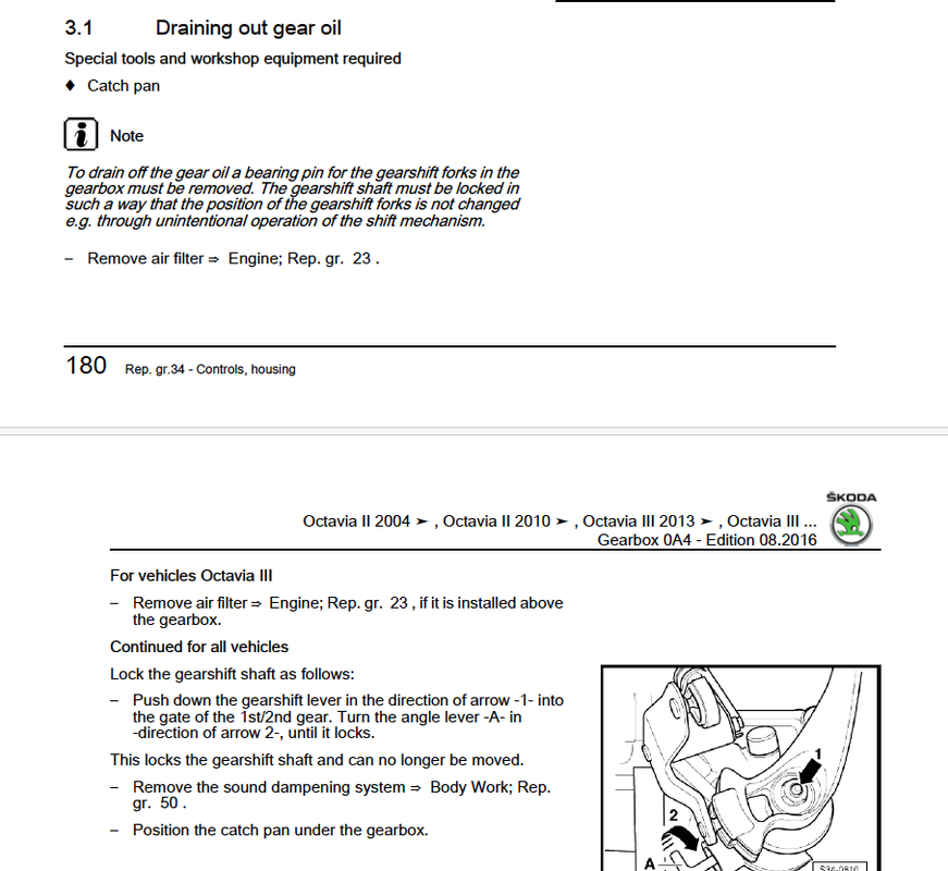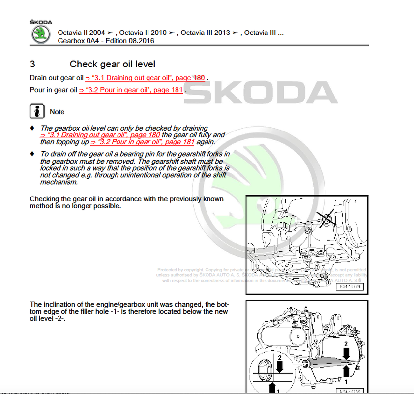 To embark on yet another tangent I discovered another VAG oddity this morning. As I intend replacing the clutch and gearbox in the MKII Octavia tomorrow I had the manual out to jot down the various torque settings and such like when I came across the gearbox oil filling procedure. I'm guessing any DIY mechanic would assume you use the filler/level plug to fill the oil and set the level as we have done on most motor cars for many many years. In fact, I watched two Youtube videos which used that method, both produced by professional mechanics. However, that seemingly logical assumption couldn't be wronger.