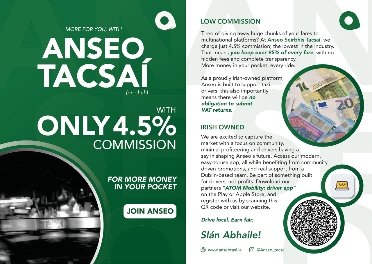 Please read our attached flyer and consider joining us through our website anseotaxi.ie/Taxi-Drivers!